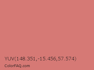 YUV 148.351,-15.456,57.574 Color is a light red color and the nearest color is New York Pink #d7837f. Hex code #d67975 and RGB value is rgb(214,121,117). In RGB color space, this color is composed of 84% red, 47% green, 46% blue, In CMYK color space, this color is composed of 0% cyan, 43% magenta, 45% yellow , 16% black , In HSL color space, this color has a hue angle of 2° , 54% saturation and 65% lightness.