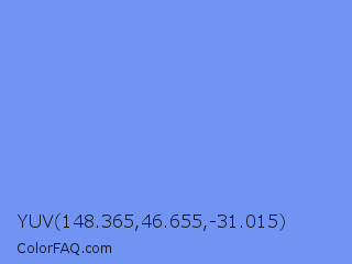 YUV 148.365,46.655,-31.015 Color is a light blue color and the nearest color is Cornflower Blue #6495ed. Hex code #7194f3 and RGB value is rgb(113,148,243). In RGB color space, this color is composed of 44% red, 58% green, 95% blue, In CMYK color space, this color is composed of 53% cyan, 39% magenta, 0% yellow , 5% black , In HSL color space, this color has a hue angle of 224° , 84% saturation and 70% lightness.