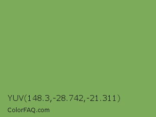 YUV 148.3,-28.742,-21.311 Color is a normal green color and the nearest color is Chelsea Cucumber #83aa5d. Hex code #7cac5a and RGB value is rgb(124,172,90). In RGB color space, this color is composed of 49% red, 67% green, 35% blue, In CMYK color space, this color is composed of 28% cyan, 0% magenta, 48% yellow , 33% black , In HSL color space, this color has a hue angle of 95° , 33% saturation and 51% lightness.