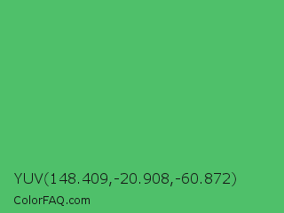 YUV 148.409,-20.908,-60.872 Color is a normal green color and the nearest color is Emerald #50c878. Hex code #4fc06a and RGB value is rgb(79,192,106). In RGB color space, this color is composed of 31% red, 75% green, 42% blue, In CMYK color space, this color is composed of 59% cyan, 0% magenta, 45% yellow , 25% black , In HSL color space, this color has a hue angle of 134° , 47% saturation and 53% lightness.