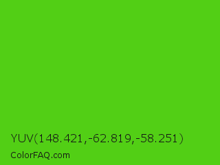 YUV 148.421,-62.819,-58.251 Color is a normal green color and the nearest color is Harlequin Green #46cb18. Hex code #52cf15 and RGB value is rgb(82,207,21). In RGB color space, this color is composed of 32% red, 81% green, 8% blue, In CMYK color space, this color is composed of 60% cyan, 0% magenta, 90% yellow , 19% black , In HSL color space, this color has a hue angle of 100° , 82% saturation and 45% lightness.