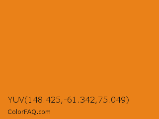 YUV 148.425,-61.342,75.049 Color is a normal orange color and the nearest color is Zest #e5841b. Hex code #ea8118 and RGB value is rgb(234,129,24). In RGB color space, this color is composed of 92% red, 51% green, 9% blue, In CMYK color space, this color is composed of 0% cyan, 45% magenta, 90% yellow , 8% black , In HSL color space, this color has a hue angle of 30° , 83% saturation and 51% lightness.