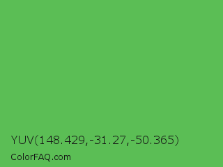 YUV 148.429,-31.27,-50.365 Color is a normal green color and the nearest color is Fern #63b76c. Hex code #5bbe55 and RGB value is rgb(91,190,85). In RGB color space, this color is composed of 36% red, 75% green, 33% blue, In CMYK color space, this color is composed of 52% cyan, 0% magenta, 55% yellow , 25% black , In HSL color space, this color has a hue angle of 117° , 45% saturation and 54% lightness.