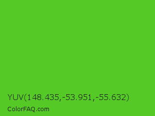 YUV 148.435,-53.951,-55.632 Color is a normal green color and the nearest color is Harlequin Green #46cb18. Hex code #55ca27 and RGB value is rgb(85,202,39). In RGB color space, this color is composed of 33% red, 79% green, 15% blue, In CMYK color space, this color is composed of 58% cyan, 0% magenta, 81% yellow , 21% black , In HSL color space, this color has a hue angle of 103° , 68% saturation and 47% lightness.