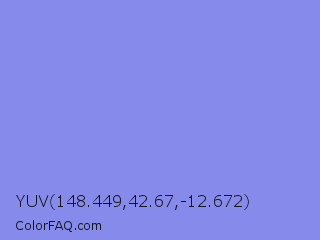 YUV 148.449,42.67,-12.672 Color is a light blue color and the nearest color is Chetwode Blue #8581d9. Hex code #868beb and RGB value is rgb(134,139,235). In RGB color space, this color is composed of 53% red, 55% green, 92% blue, In CMYK color space, this color is composed of 43% cyan, 41% magenta, 0% yellow , 8% black , In HSL color space, this color has a hue angle of 237° , 72% saturation and 72% lightness.