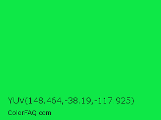 YUV 148.464,-38.19,-117.925 Color is a normal green color and the nearest color is Malachite #0bda51. Hex code #0ee847 and RGB value is rgb(14,232,71). In RGB color space, this color is composed of 5% red, 91% green, 28% blue, In CMYK color space, this color is composed of 94% cyan, 0% magenta, 69% yellow , 9% black , In HSL color space, this color has a hue angle of 136° , 89% saturation and 48% lightness.