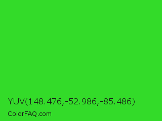 YUV 148.476,-52.986,-85.486 Color is a normal green color and the nearest color is Lime Green #32cd32. Hex code #33db29 and RGB value is rgb(51,219,41). In RGB color space, this color is composed of 20% red, 86% green, 16% blue, In CMYK color space, this color is composed of 77% cyan, 0% magenta, 81% yellow , 14% black , In HSL color space, this color has a hue angle of 117° , 71% saturation and 51% lightness.