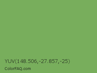 YUV 148.506,-27.857,-25 Color is a normal green color and the nearest color is Bud Green #7bb661. Hex code #78ae5c and RGB value is rgb(120,174,92). In RGB color space, this color is composed of 47% red, 68% green, 36% blue, In CMYK color space, this color is composed of 31% cyan, 0% magenta, 47% yellow , 32% black , In HSL color space, this color has a hue angle of 100° , 34% saturation and 52% lightness.