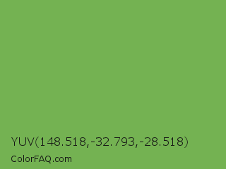 YUV 148.518,-32.793,-28.518 Color is a normal green color and the nearest color is Bud Green #7bb661. Hex code #74b252 and RGB value is rgb(116,178,82). In RGB color space, this color is composed of 45% red, 70% green, 32% blue, In CMYK color space, this color is composed of 35% cyan, 0% magenta, 54% yellow , 30% black , In HSL color space, this color has a hue angle of 99° , 38% saturation and 51% lightness.