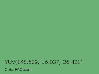 YUV 148.529,-16.037,-36.421 Color is a normal green color and the nearest color is Fern #63b76c. Hex code #6bb074 and RGB value is rgb(107,176,116). In RGB color space, this color is composed of 42% red, 69% green, 45% blue, In CMYK color space, this color is composed of 39% cyan, 0% magenta, 34% yellow , 31% black , In HSL color space, this color has a hue angle of 128° , 30% saturation and 55% lightness.