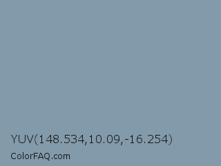 YUV 148.534,10.09,-16.254 Color is a normal blue color and the nearest color is Weldon Blue #7c98ab. Hex code #829aa9 and RGB value is rgb(130,154,169). In RGB color space, this color is composed of 51% red, 60% green, 66% blue, In CMYK color space, this color is composed of 23% cyan, 9% magenta, 0% yellow , 34% black , In HSL color space, this color has a hue angle of 203° , 18% saturation and 59% lightness.