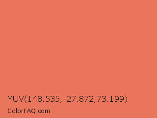 YUV 148.535,-27.872,73.199 Color is a light red color and the nearest color is Terracotta #e2725b. Hex code #e8755c and RGB value is rgb(232,117,92). In RGB color space, this color is composed of 91% red, 46% green, 36% blue, In CMYK color space, this color is composed of 0% cyan, 50% magenta, 60% yellow , 9% black , In HSL color space, this color has a hue angle of 11° , 75% saturation and 64% lightness.