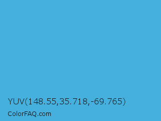 YUV 148.55,35.718,-69.765 Color is a normal blue color and the nearest color is Picton Blue #45b1e8. Hex code #45afdd and RGB value is rgb(69,175,221). In RGB color space, this color is composed of 27% red, 69% green, 87% blue, In CMYK color space, this color is composed of 69% cyan, 21% magenta, 0% yellow , 13% black , In HSL color space, this color has a hue angle of 198° , 69% saturation and 57% lightness.