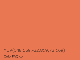 YUV 148.569,-32.819,73.169 Color is a light color and the nearest color is Burnt Sienna #e97451. Hex code #e87752 and RGB value is rgb(232,119,82). In RGB color space, this color is composed of 91% red, 47% green, 32% blue, In CMYK color space, this color is composed of 0% cyan, 49% magenta, 65% yellow , 9% black , In HSL color space, this color has a hue angle of 15° , 77% saturation and 62% lightness.