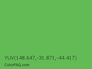YUV 148.647,-31.871,-44.417 Color is a normal green color and the nearest color is Fern #63b76c. Hex code #62bb54 and RGB value is rgb(98,187,84). In RGB color space, this color is composed of 38% red, 73% green, 33% blue, In CMYK color space, this color is composed of 48% cyan, 0% magenta, 55% yellow , 27% black , In HSL color space, this color has a hue angle of 112° , 43% saturation and 53% lightness.