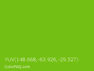 YUV 148.668,-63.926,-29.527 Color is a normal green color and the nearest color is Lima #76bd17. Hex code #73bf13 and RGB value is rgb(115,191,19). In RGB color space, this color is composed of 45% red, 75% green, 7% blue, In CMYK color space, this color is composed of 40% cyan, 0% magenta, 90% yellow , 25% black , In HSL color space, this color has a hue angle of 87° , 82% saturation and 41% lightness.