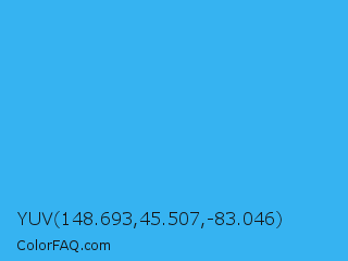 YUV 148.693,45.507,-83.046 Color is a normal blue color and the nearest color is Picton Blue #45b1e8. Hex code #36b3f1 and RGB value is rgb(54,179,241). In RGB color space, this color is composed of 21% red, 70% green, 95% blue, In CMYK color space, this color is composed of 78% cyan, 26% magenta, 0% yellow , 5% black , In HSL color space, this color has a hue angle of 200° , 87% saturation and 58% lightness.