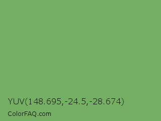 YUV 148.695,-24.5,-28.674 Color is a normal green color and the nearest color is Bud Green #7bb661. Hex code #74af63 and RGB value is rgb(116,175,99). In RGB color space, this color is composed of 45% red, 69% green, 39% blue, In CMYK color space, this color is composed of 34% cyan, 0% magenta, 43% yellow , 31% black , In HSL color space, this color has a hue angle of 107° , 32% saturation and 54% lightness.