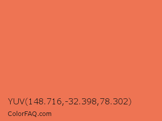 YUV 148.716,-32.398,78.302 Color is a light red color and the nearest color is Burnt Sienna #e97451. Hex code #ee7453 and RGB value is rgb(238,116,83). In RGB color space, this color is composed of 93% red, 45% green, 33% blue, In CMYK color space, this color is composed of 0% cyan, 51% magenta, 65% yellow , 7% black , In HSL color space, this color has a hue angle of 13° , 82% saturation and 63% lightness.