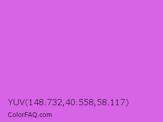 YUV 148.732,40.558,58.117 Color is a light magenta color and the nearest color is Orchid #da70d6. Hex code #d763e7 and RGB value is rgb(215,99,231). In RGB color space, this color is composed of 84% red, 39% green, 91% blue, In CMYK color space, this color is composed of 7% cyan, 57% magenta, 0% yellow , 9% black , In HSL color space, this color has a hue angle of 293° , 73% saturation and 65% lightness.