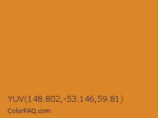YUV 148.802,-53.146,59.81 Color is a normal orange color and the nearest color is Brandy Punch #cd8429. Hex code #d98729 and RGB value is rgb(217,135,41). In RGB color space, this color is composed of 85% red, 53% green, 16% blue, In CMYK color space, this color is composed of 0% cyan, 38% magenta, 81% yellow , 15% black , In HSL color space, this color has a hue angle of 32° , 70% saturation and 51% lightness.