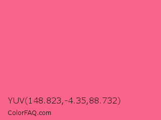 YUV 148.823,-4.35,88.732 Color is a light rose color and the nearest color is Light Crimson #f56991. Hex code #fa638c and RGB value is rgb(250,99,140). In RGB color space, this color is composed of 98% red, 39% green, 55% blue, In CMYK color space, this color is composed of 0% cyan, 60% magenta, 44% yellow , 2% black , In HSL color space, this color has a hue angle of 344° , 94% saturation and 68% lightness.