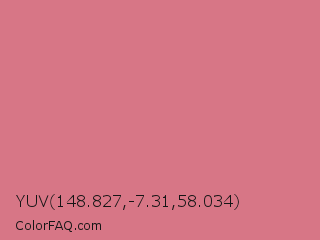 YUV 148.827,-7.31,58.034 Color is a light red color and the nearest color is Charm #d47494. Hex code #d77686 and RGB value is rgb(215,118,134). In RGB color space, this color is composed of 84% red, 46% green, 53% blue, In CMYK color space, this color is composed of 0% cyan, 45% magenta, 38% yellow , 16% black , In HSL color space, this color has a hue angle of 350° , 55% saturation and 65% lightness.