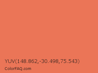 YUV 148.862,-30.498,75.543 Color is a light red color and the nearest color is Burnt Sienna #e97451. Hex code #eb7557 and RGB value is rgb(235,117,87). In RGB color space, this color is composed of 92% red, 46% green, 34% blue, In CMYK color space, this color is composed of 0% cyan, 50% magenta, 63% yellow , 8% black , In HSL color space, this color has a hue angle of 12° , 79% saturation and 63% lightness.