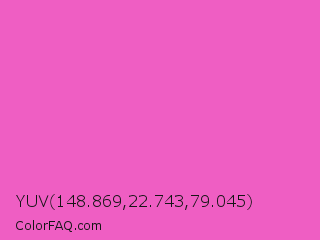 YUV 148.869,22.743,79.045 Color is a light magenta color and the nearest color is Light Deep Pink #ff5ccd. Hex code #ef5ec3 and RGB value is rgb(239,94,195). In RGB color space, this color is composed of 94% red, 37% green, 76% blue, In CMYK color space, this color is composed of 0% cyan, 61% magenta, 18% yellow , 6% black , In HSL color space, this color has a hue angle of 318° , 82% saturation and 65% lightness.