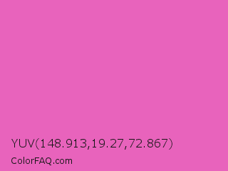 YUV 148.913,19.27,72.867 Color is a light magenta color and the nearest color is Hot Pink #ff69b4. Hex code #e863bc and RGB value is rgb(232,99,188). In RGB color space, this color is composed of 91% red, 39% green, 74% blue, In CMYK color space, this color is composed of 0% cyan, 57% magenta, 19% yellow , 9% black , In HSL color space, this color has a hue angle of 320° , 74% saturation and 65% lightness.