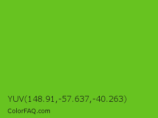 YUV 148.91,-57.637,-40.263 Color is a normal green color and the nearest color is Lima #76bd17. Hex code #67c320 and RGB value is rgb(103,195,32). In RGB color space, this color is composed of 40% red, 76% green, 13% blue, In CMYK color space, this color is composed of 47% cyan, 0% magenta, 84% yellow , 24% black , In HSL color space, this color has a hue angle of 94° , 72% saturation and 45% lightness.