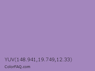 YUV 148.941,19.749,12.33 Color is a light purple color and the nearest color is African Violet #b284be. Hex code #a386bd and RGB value is rgb(163,134,189). In RGB color space, this color is composed of 64% red, 53% green, 74% blue, In CMYK color space, this color is composed of 14% cyan, 29% magenta, 0% yellow , 26% black , In HSL color space, this color has a hue angle of 272° , 29% saturation and 63% lightness.