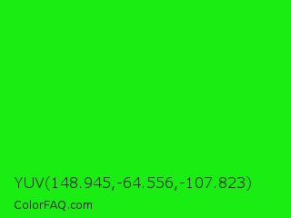 YUV 148.945,-64.556,-107.823 Color is a normal green color and the nearest color is Neon Green #39ff14. Hex code #1aed12 and RGB value is rgb(26,237,18). In RGB color space, this color is composed of 10% red, 93% green, 7% blue, In CMYK color space, this color is composed of 89% cyan, 0% magenta, 92% yellow , 7% black , In HSL color space, this color has a hue angle of 118° , 86% saturation and 50% lightness.
