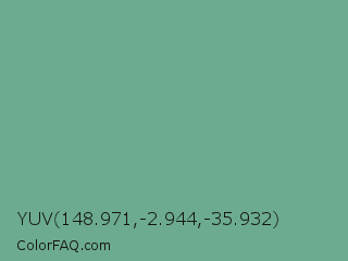 YUV 148.971,-2.944,-35.932 Color is a normal green color and the nearest color is Silver Tree #66b58f. Hex code #6cab8f and RGB value is rgb(108,171,143). In RGB color space, this color is composed of 42% red, 67% green, 56% blue, In CMYK color space, this color is composed of 37% cyan, 0% magenta, 16% yellow , 33% black , In HSL color space, this color has a hue angle of 153° , 27% saturation and 55% lightness.