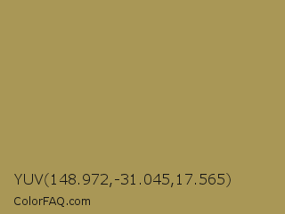 YUV 148.972,-31.045,17.565 Color is a normal yellow color and the nearest color is Muesli #aa8b5b. Hex code #a99756 and RGB value is rgb(169,151,86). In RGB color space, this color is composed of 66% red, 59% green, 34% blue, In CMYK color space, this color is composed of 0% cyan, 11% magenta, 49% yellow , 34% black , In HSL color space, this color has a hue angle of 47° , 33% saturation and 50% lightness.