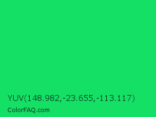 YUV 148.982,-23.655,-113.117 Color is a normal green color and the nearest color is Malachite #0bda51. Hex code #14e065 and RGB value is rgb(20,224,101). In RGB color space, this color is composed of 8% red, 88% green, 40% blue, In CMYK color space, this color is composed of 91% cyan, 0% magenta, 55% yellow , 12% black , In HSL color space, this color has a hue angle of 144° , 84% saturation and 48% lightness.
