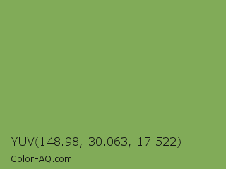 YUV 148.98,-30.063,-17.522 Color is a normal green color and the nearest color is Chelsea Cucumber #83aa5d. Hex code #81ab58 and RGB value is rgb(129,171,88). In RGB color space, this color is composed of 51% red, 67% green, 35% blue, In CMYK color space, this color is composed of 25% cyan, 0% magenta, 49% yellow , 33% black , In HSL color space, this color has a hue angle of 90° , 33% saturation and 51% lightness.