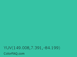 YUV 149.008,7.391,-84.199 Color is a normal cyan color and the nearest color is Puerto Rico #3fc1aa. Hex code #35c3a4 and RGB value is rgb(53,195,164). In RGB color space, this color is composed of 21% red, 76% green, 64% blue, In CMYK color space, this color is composed of 73% cyan, 0% magenta, 16% yellow , 24% black , In HSL color space, this color has a hue angle of 167° , 57% saturation and 49% lightness.