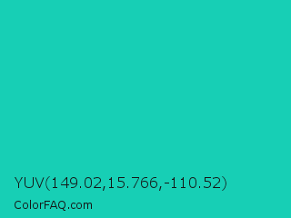 YUV 149.02,15.766,-110.52 Color is a normal cyan color and the nearest color is Java #1fc2c2. Hex code #17cfb5 and RGB value is rgb(23,207,181). In RGB color space, this color is composed of 9% red, 81% green, 71% blue, In CMYK color space, this color is composed of 89% cyan, 0% magenta, 13% yellow , 19% black , In HSL color space, this color has a hue angle of 172° , 80% saturation and 45% lightness.