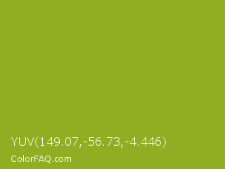 YUV 149.07,-56.73,-4.446 Color is a normal lime color and the nearest color is Citron #9fa91f. Hex code #90ae22 and RGB value is rgb(144,174,34). In RGB color space, this color is composed of 56% red, 68% green, 13% blue, In CMYK color space, this color is composed of 17% cyan, 0% magenta, 80% yellow , 32% black , In HSL color space, this color has a hue angle of 73° , 67% saturation and 41% lightness.
