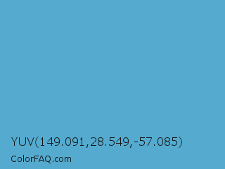 YUV 149.091,28.549,-57.085 Color is a normal blue color and the nearest color is Shakespeare #4eabd1. Hex code #54abcf and RGB value is rgb(84,171,207). In RGB color space, this color is composed of 33% red, 67% green, 81% blue, In CMYK color space, this color is composed of 59% cyan, 17% magenta, 0% yellow , 19% black , In HSL color space, this color has a hue angle of 198° , 56% saturation and 57% lightness.