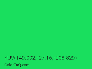 YUV 149.092,-27.16,-108.829 Color is a normal green color and the nearest color is Malachite #0bda51. Hex code #19df5e and RGB value is rgb(25,223,94). In RGB color space, this color is composed of 10% red, 87% green, 37% blue, In CMYK color space, this color is composed of 89% cyan, 0% magenta, 58% yellow , 13% black , In HSL color space, this color has a hue angle of 141° , 80% saturation and 49% lightness.