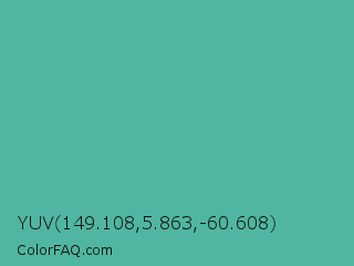 YUV 149.108,5.863,-60.608 Color is a normal cyan color and the nearest color is Verdigris #43b3ae. Hex code #50b6a1 and RGB value is rgb(80,182,161). In RGB color space, this color is composed of 31% red, 71% green, 63% blue, In CMYK color space, this color is composed of 56% cyan, 0% magenta, 12% yellow , 29% black , In HSL color space, this color has a hue angle of 168° , 41% saturation and 51% lightness.