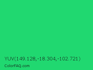 YUV 149.128,-18.304,-102.721 Color is a normal green color and the nearest color is UFO Green #3cd070. Hex code #20d870 and RGB value is rgb(32,216,112). In RGB color space, this color is composed of 13% red, 85% green, 44% blue, In CMYK color space, this color is composed of 85% cyan, 0% magenta, 48% yellow , 15% black , In HSL color space, this color has a hue angle of 146° , 74% saturation and 49% lightness.