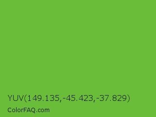 YUV 149.135,-45.423,-37.829 Color is a normal green color and the nearest color is Green RYB #66b032. Hex code #6abd39 and RGB value is rgb(106,189,57). In RGB color space, this color is composed of 42% red, 74% green, 22% blue, In CMYK color space, this color is composed of 44% cyan, 0% magenta, 70% yellow , 26% black , In HSL color space, this color has a hue angle of 98° , 54% saturation and 48% lightness.