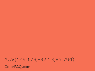 YUV 149.173,-32.13,85.794 Color is a light red color and the nearest color is Persimmon #ff6b53. Hex code #f77054 and RGB value is rgb(247,112,84). In RGB color space, this color is composed of 97% red, 44% green, 33% blue, In CMYK color space, this color is composed of 0% cyan, 55% magenta, 66% yellow , 3% black , In HSL color space, this color has a hue angle of 10° , 91% saturation and 65% lightness.
