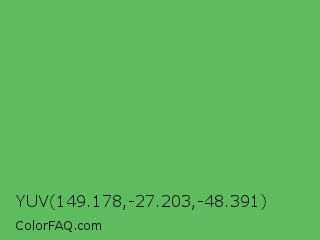 YUV 149.178,-27.203,-48.391 Color is a normal green color and the nearest color is Fern #63b76c. Hex code #5ebc5e and RGB value is rgb(94,188,94). In RGB color space, this color is composed of 37% red, 74% green, 37% blue, In CMYK color space, this color is composed of 50% cyan, 0% magenta, 50% yellow , 26% black , In HSL color space, this color has a hue angle of 120° , 41% saturation and 55% lightness.