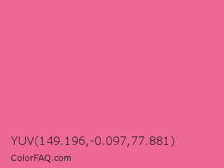 YUV 149.196,-0.097,77.881 Color is a light rose color and the nearest color is Light Crimson #f56991. Hex code #ee6895 and RGB value is rgb(238,104,149). In RGB color space, this color is composed of 93% red, 41% green, 58% blue, In CMYK color space, this color is composed of 0% cyan, 56% magenta, 37% yellow , 7% black , In HSL color space, this color has a hue angle of 340° , 80% saturation and 67% lightness.