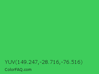 YUV 149.247,-28.716,-76.516 Color is a normal green color and the nearest color is UFO Green #3cd070. Hex code #3ecd5b and RGB value is rgb(62,205,91). In RGB color space, this color is composed of 24% red, 80% green, 36% blue, In CMYK color space, this color is composed of 70% cyan, 0% magenta, 56% yellow , 20% black , In HSL color space, this color has a hue angle of 132° , 59% saturation and 52% lightness.