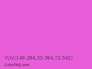 YUV 149.284,33.384,72.542 Color is a light magenta color and the nearest color is Orchid #da70d6. Hex code #e85ed9 and RGB value is rgb(232,94,217). In RGB color space, this color is composed of 91% red, 37% green, 85% blue, In CMYK color space, this color is composed of 0% cyan, 59% magenta, 6% yellow , 9% black , In HSL color space, this color has a hue angle of 307° , 75% saturation and 64% lightness.